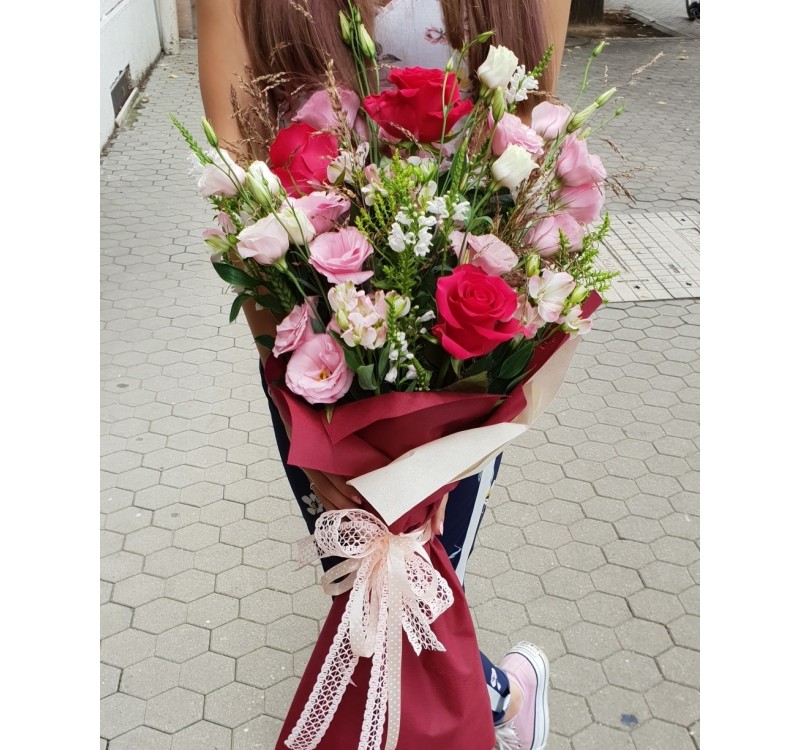 Прекрасен избор от микс еквадорски рози и еустома. Композиран във височина. Стилен и присъствен. Приблизителни размери 35х35 см,
